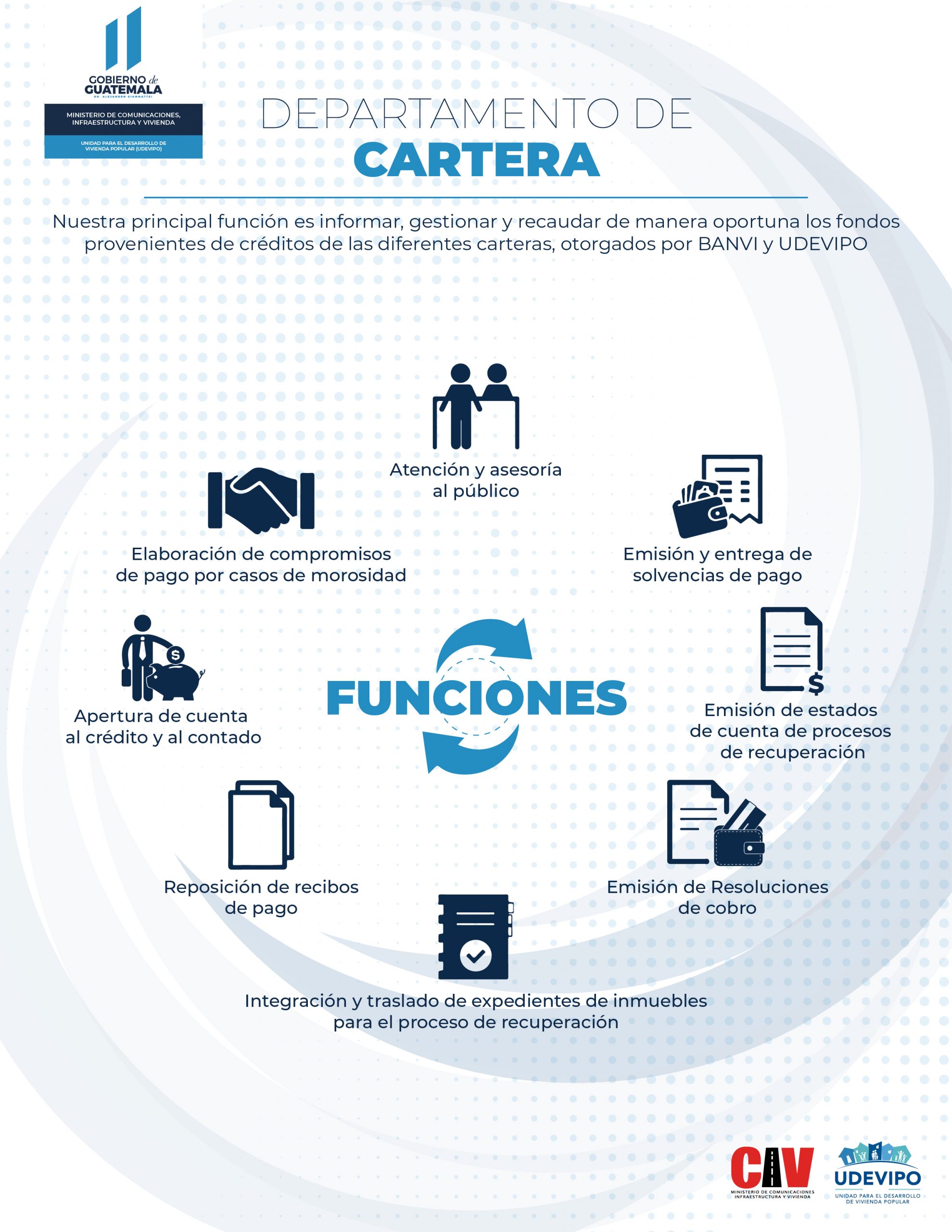 En el Departamento de Cartera, se atiende y asesora a las y los usuarios en los procesos como: emisión y entrega de Solvencia de Pago del bien inmueble, elaboración de compromisos de pago en caso de morosidad, búsqueda o reimpresión de su último recibo de cancelación en caso de extravío, asimismo, informa, gestiona y recauda de manera oportuna los fondos provenientes de créditos de las diferentes carteras, otorgadas por BANVI Y UDEVIPO.
