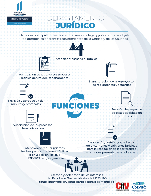 El Departamento Jurídico tiene como principales funciones: brindar asesoría legal tanto a los usuarios como a la Unidad, verifica procesos de escrituración, elabora, revisa y aprueba dictámenes y opiniones jurídicas para la resolución de las diferentes solicitudes presentadas a la Unidad.