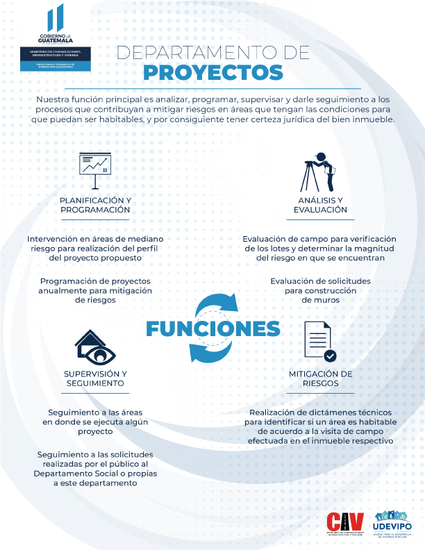 Asimismo, el Departamento de Proyectos tiene como principales funciones darle seguimiento a procesos que contribuyan a mitigar algún punto de riesgo en comunidades bajo la administración de UDEVIPO. Evaluar solicitudes para la construcción de muros de contención y/o recubrimiento, así como elaborar dictámenes técnicos de habitabilidad de los inmuebles a legalizar.