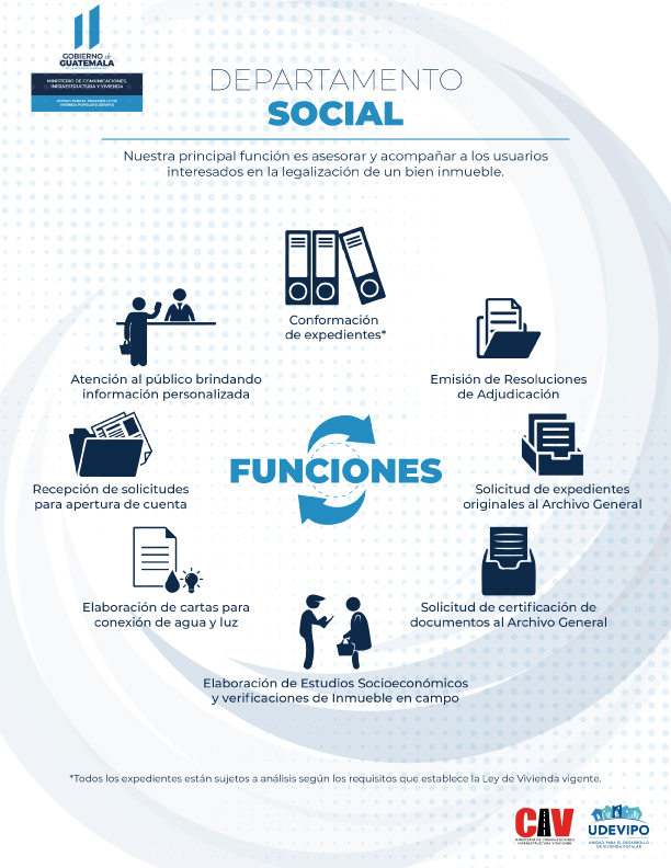 En el Departamento Social se le brinda acompañamiento y asesora a los usuarios que cumplan con los requisitos de ley, para la adjudicación del bien inmueble en el que habitan, cuya propiedad es del Estado de Guatemala.